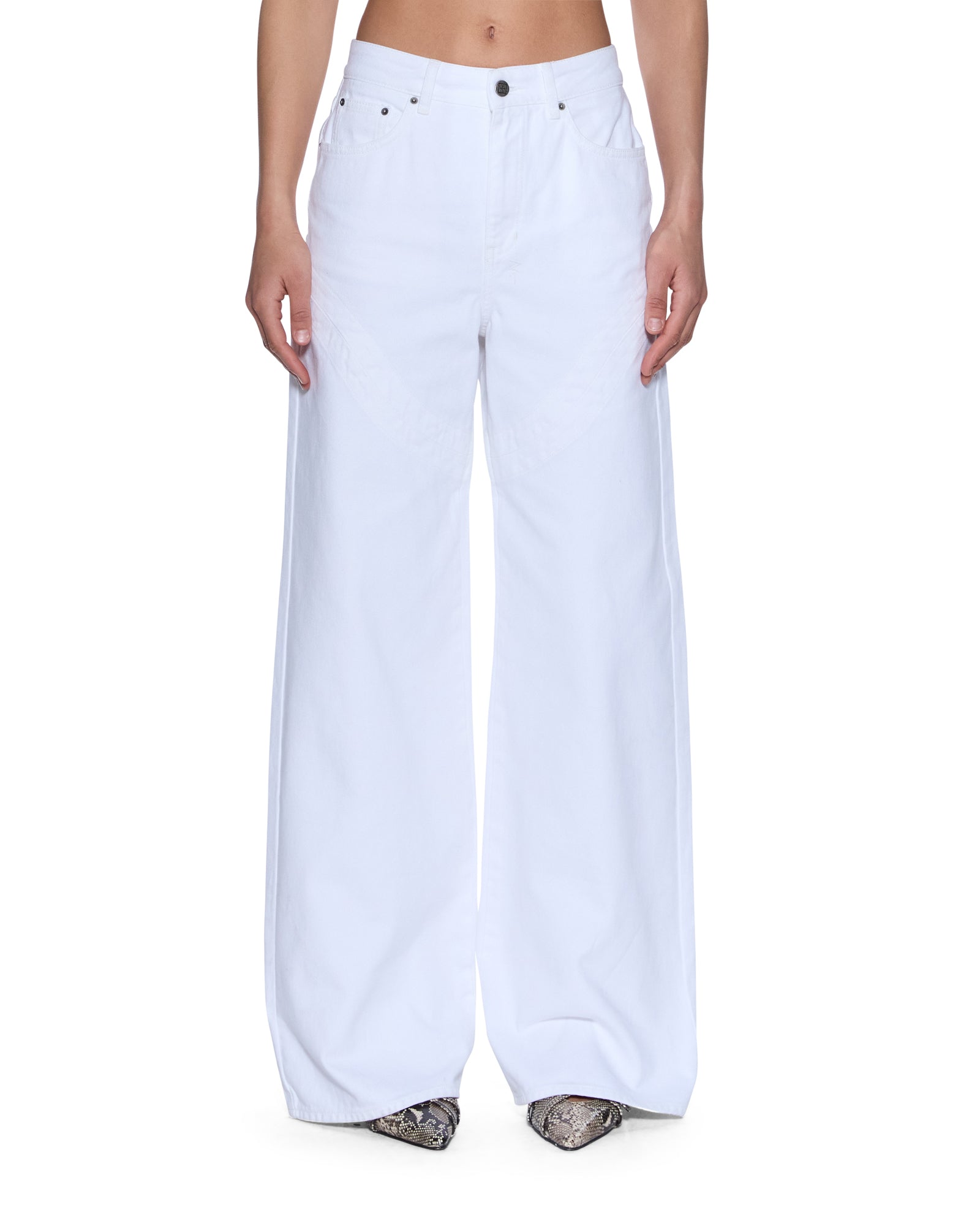 The Strider Saddle Fresh is a wide-leg, full-length jean with a super high rise, designed to create a flattering silhouette. Made from premium European rigid denim in fresh white with tonal topstitching, it features curved western-inspired panel lines on the front and back thighs, five-pocket styling, T-box and 3x4 embroidery, and a removable Ksubi pocket tag. Style back with the Trucker Vest Fresh for an all-white elevated look.