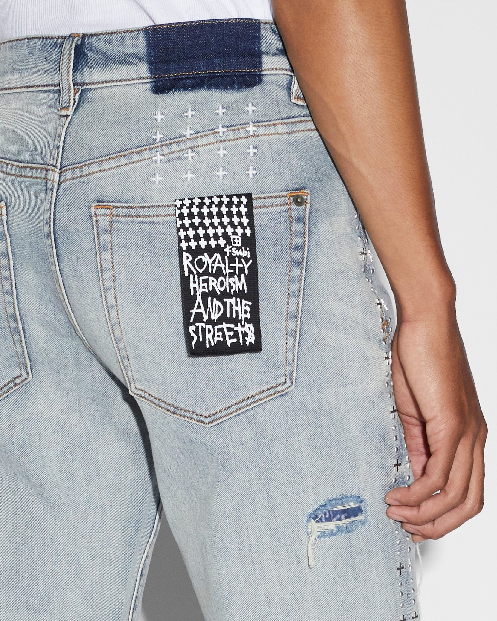 The Bronko Dyanamite Metal is an indigo denim, full length jean with a bootcut finish. This stone washed jean features a metallic hotfix pattern running down both side seams. Showcasing deconstruction details across the leg with printed repair fabric underneath with heritage Ksubi artwork. Finished with signature embroidery and Ksubi branded hardware.