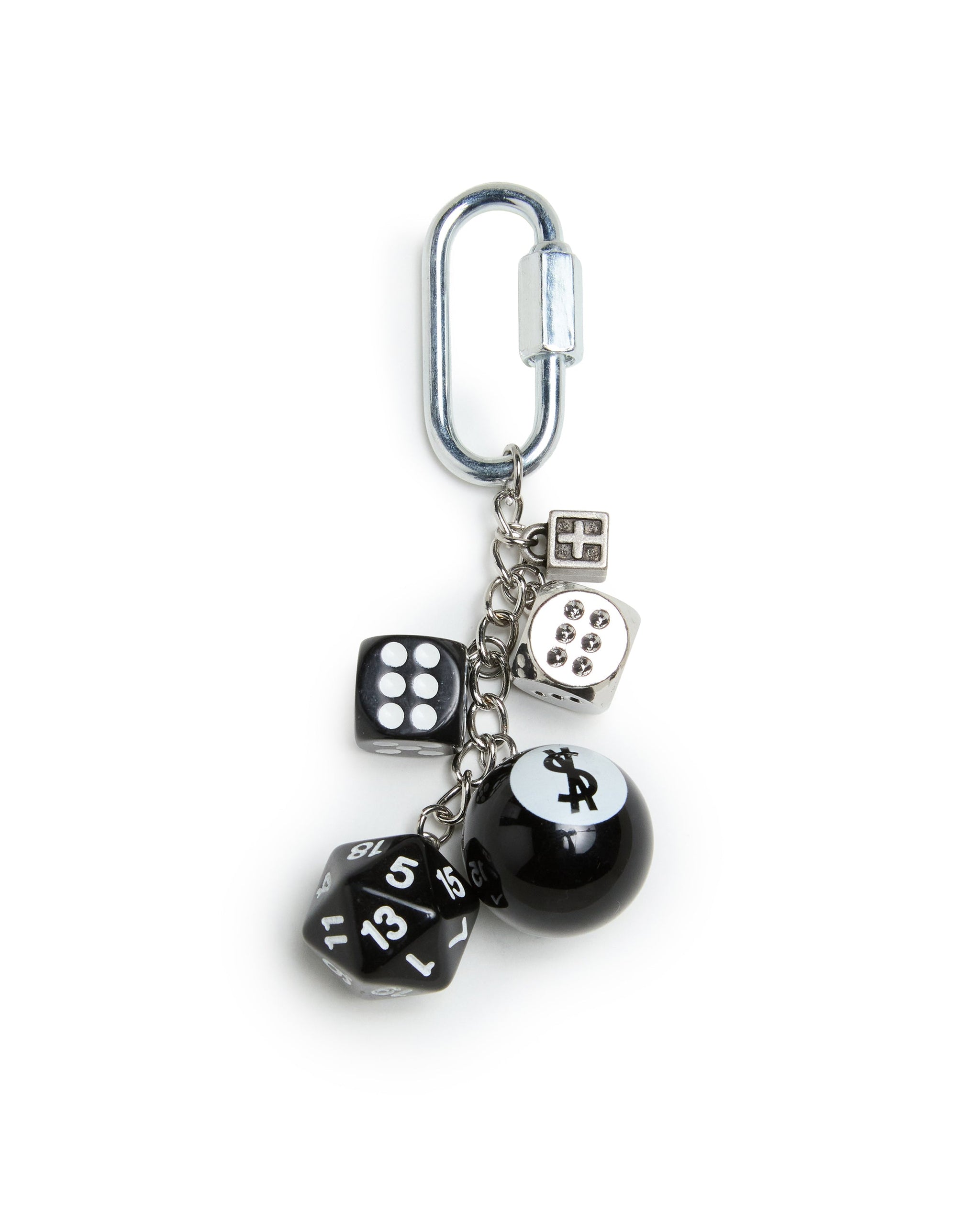 The Roll the Dice Keychain features the iconic T-box charm, and the custom Ksubi cross-dollar logo on the pool ball. It features a split ring and screw open carabiner in gun metal in antique silver.