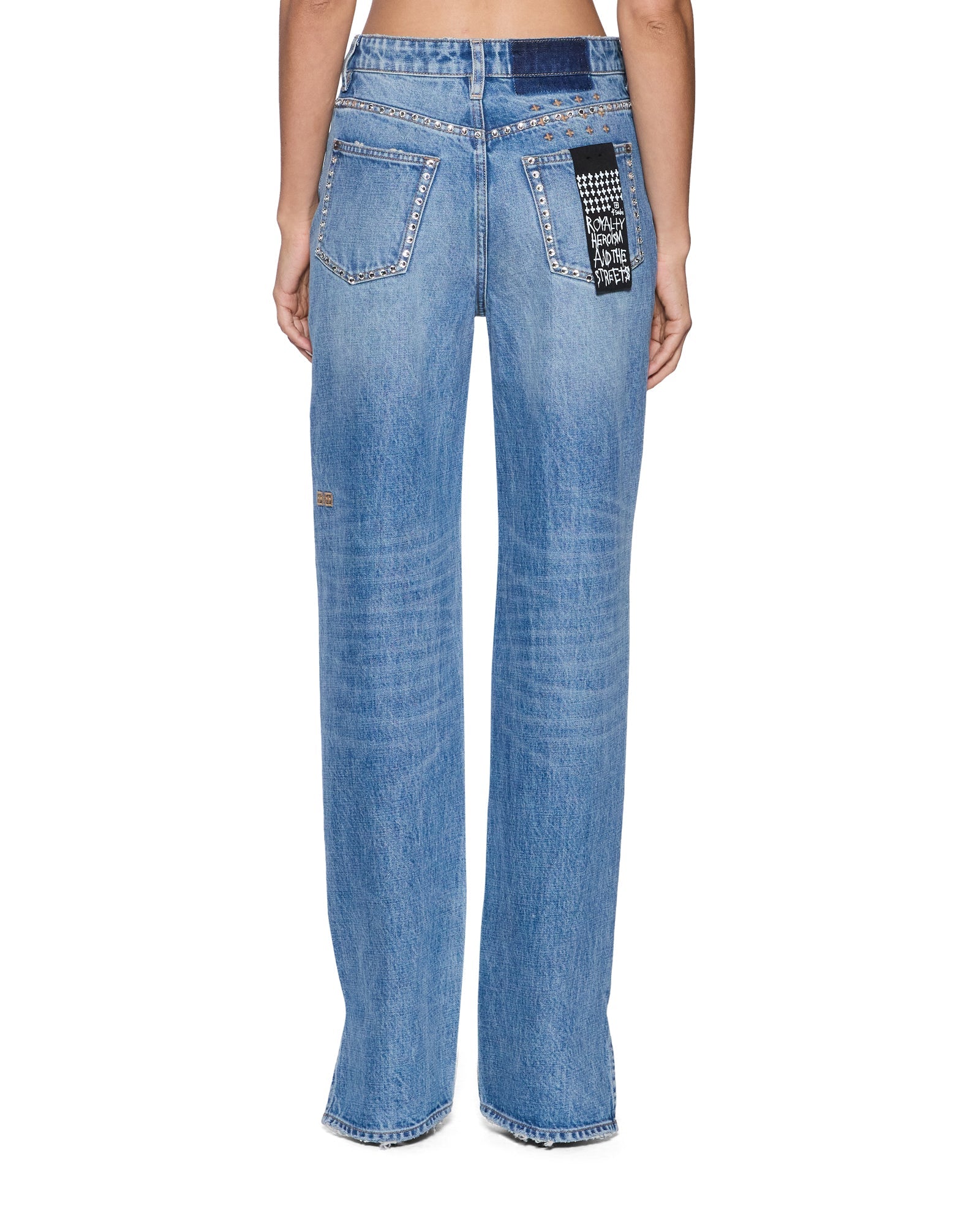 The Playback Jean 2.0 Maverik Krystal is a modern update to the iconic Playback silhouette, featuring a straighter leg opening, relaxed fit through the seat, and slightly shorter rise while maintaining a full-length, high-rise shape. Crafted from premium rigid denim with a vintage mid-blue stone wash, worn-in wear patterns, and tobacco topstitching, the style is finished with diamante studs along the front pocket openings, down the side seams, and around the back pocket edges for an elevated statement aesthetic.