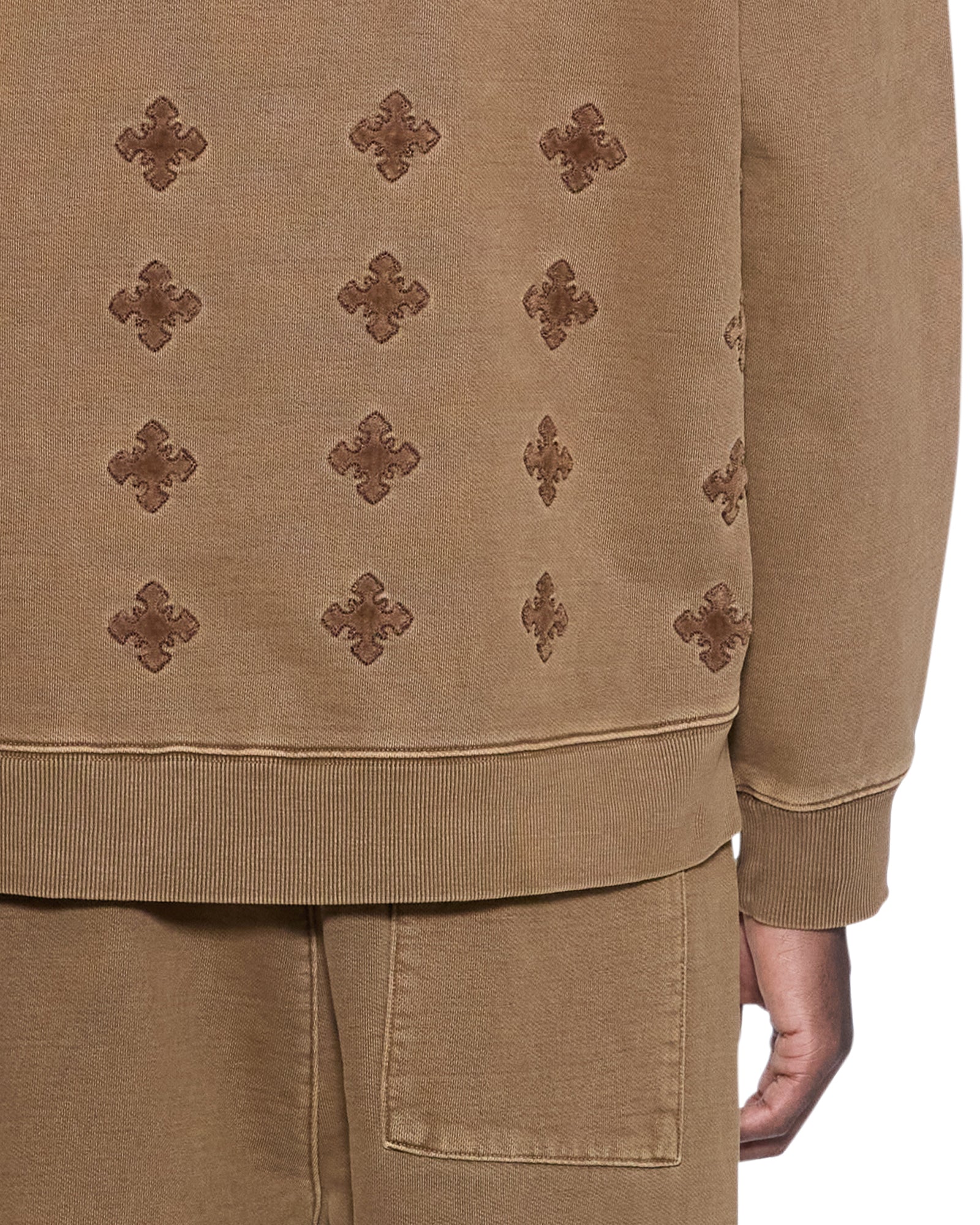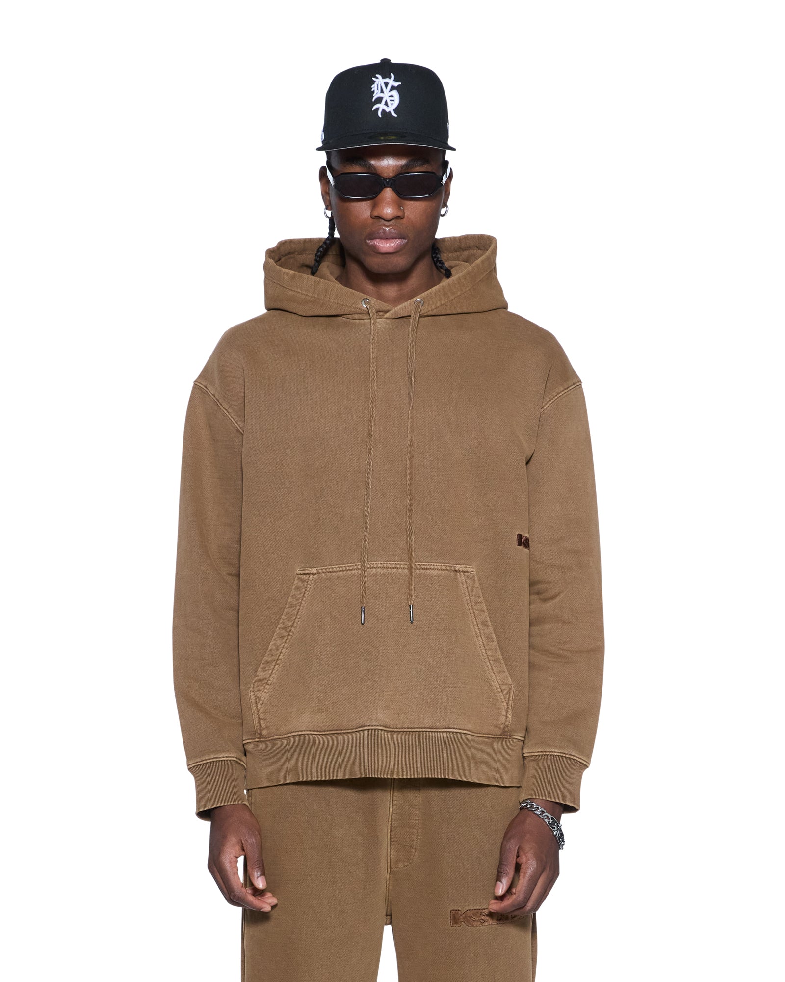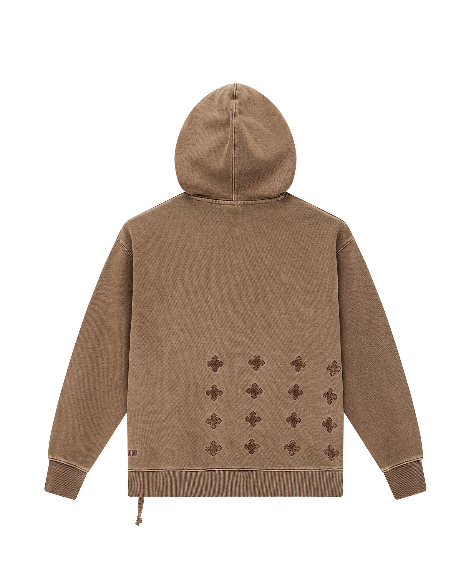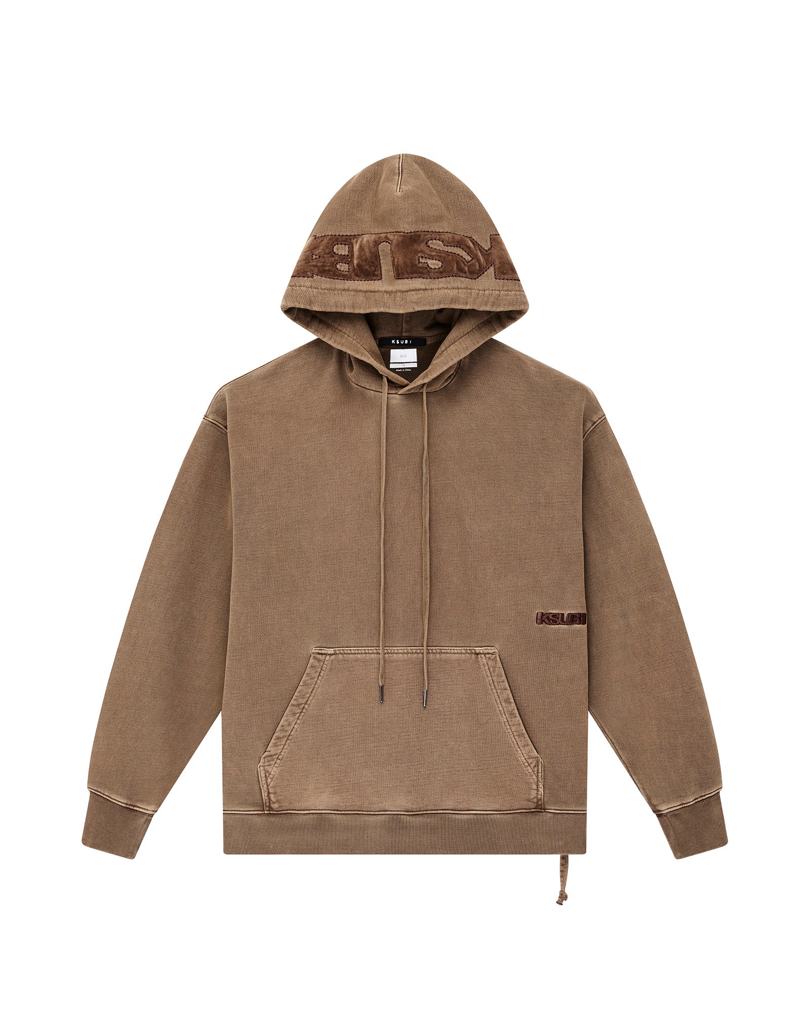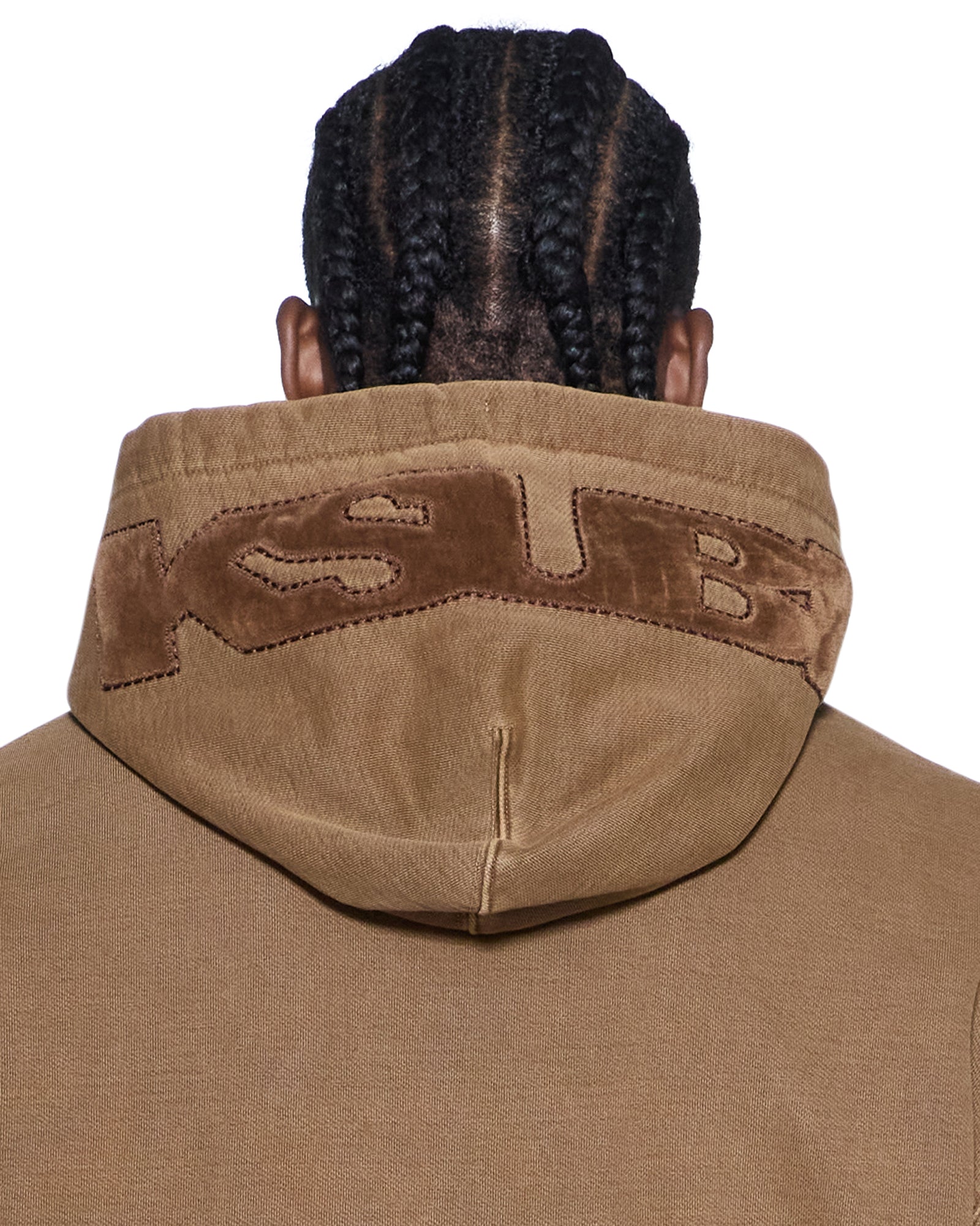 The 4X4 Paise Biggie Hoodie Espresso is an oversized fit hoodie with drawstrings, metal hardware, and signature rats tail. Crafted from premium loopback fleece in espresso brown, it features a tonal flocked applique Sign of the Times artwork on the hood with saddle stitching, front embroidery, and is finished with signature T-box and flocked-applique 4x4 branding.