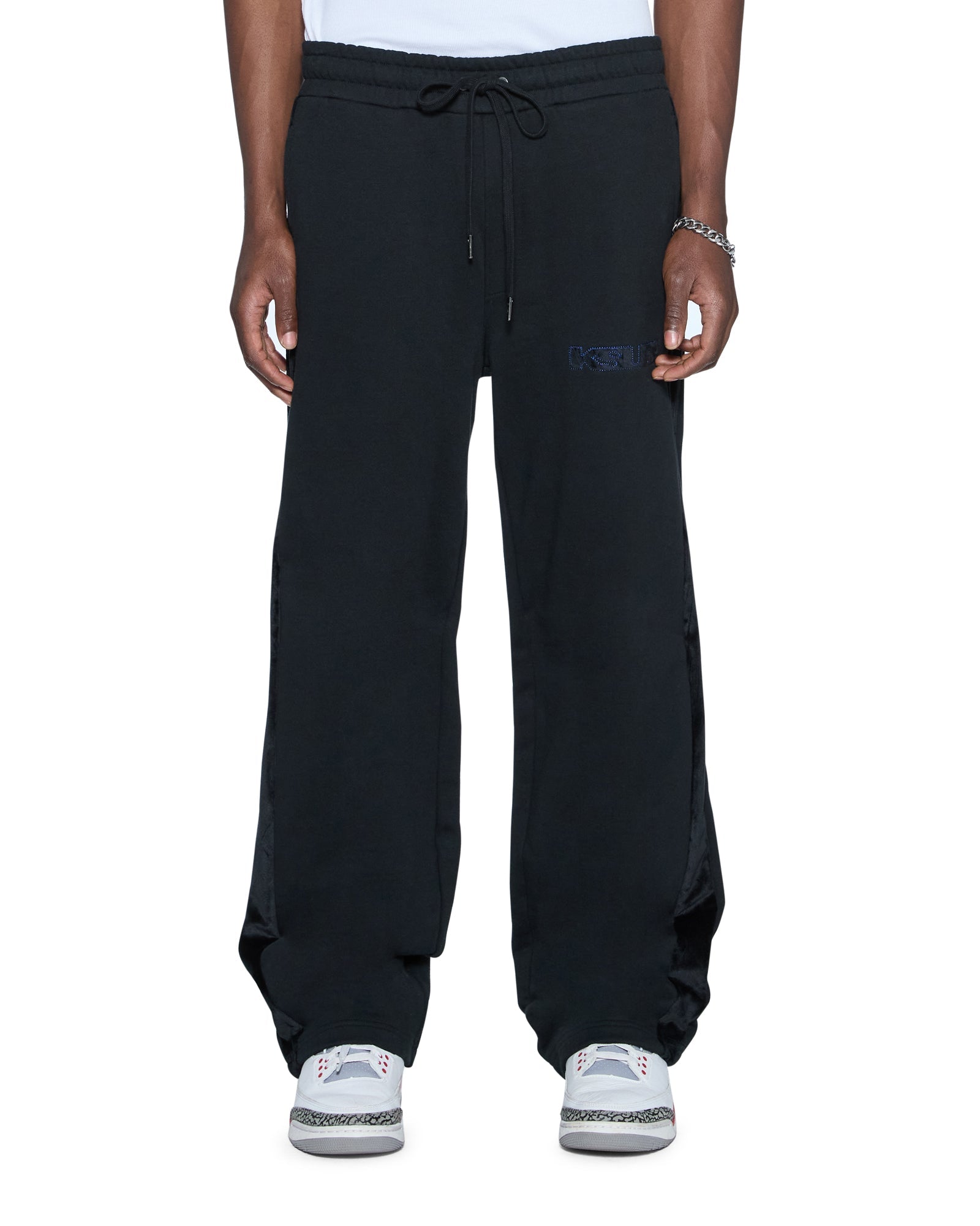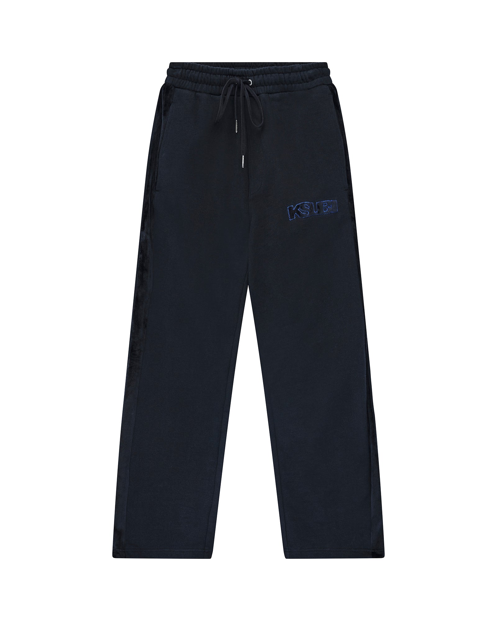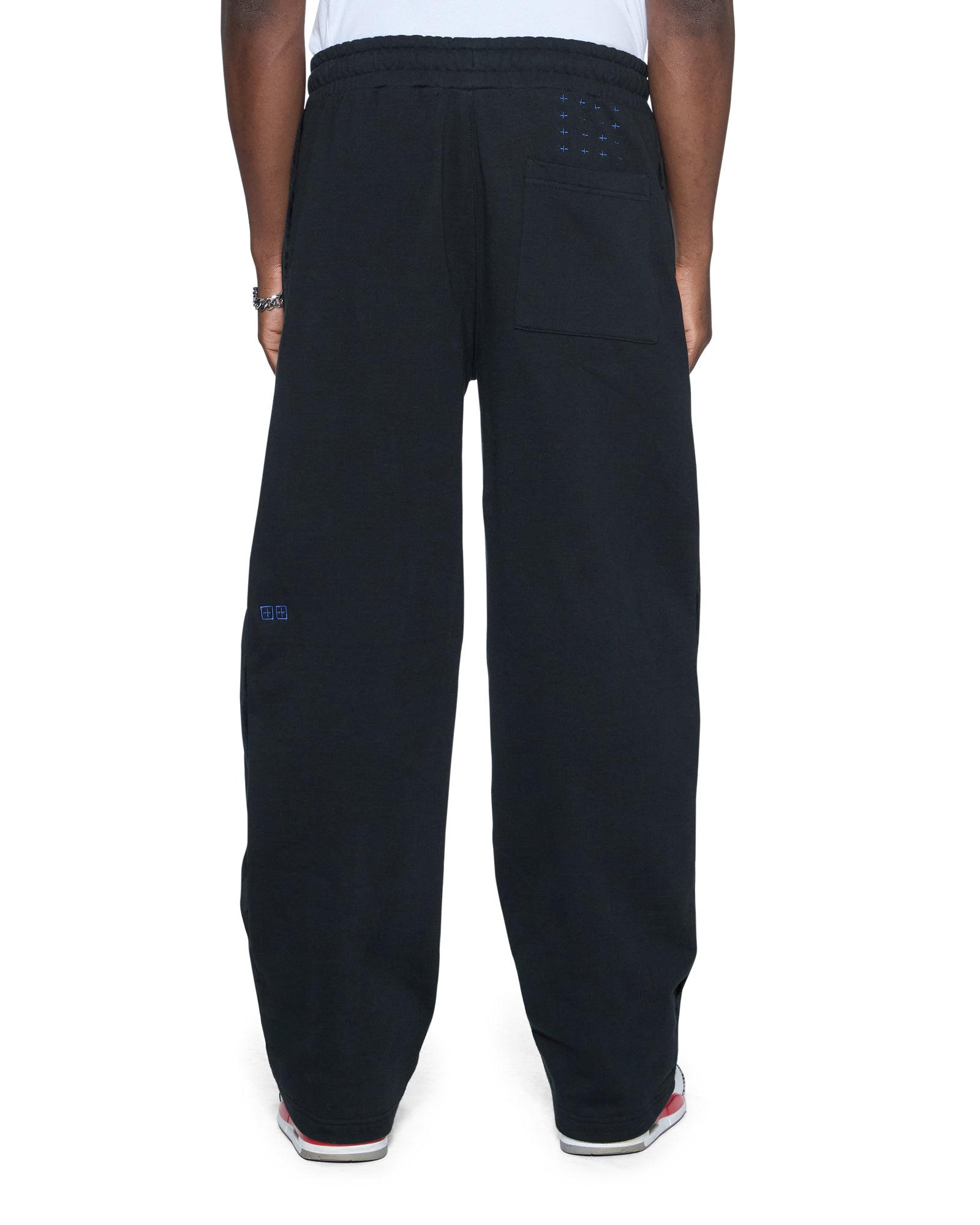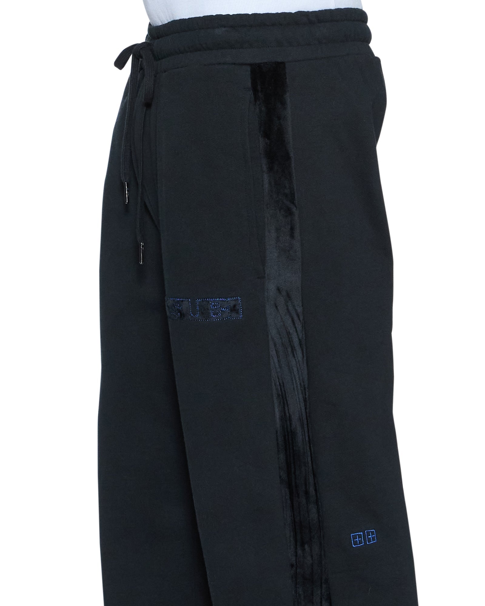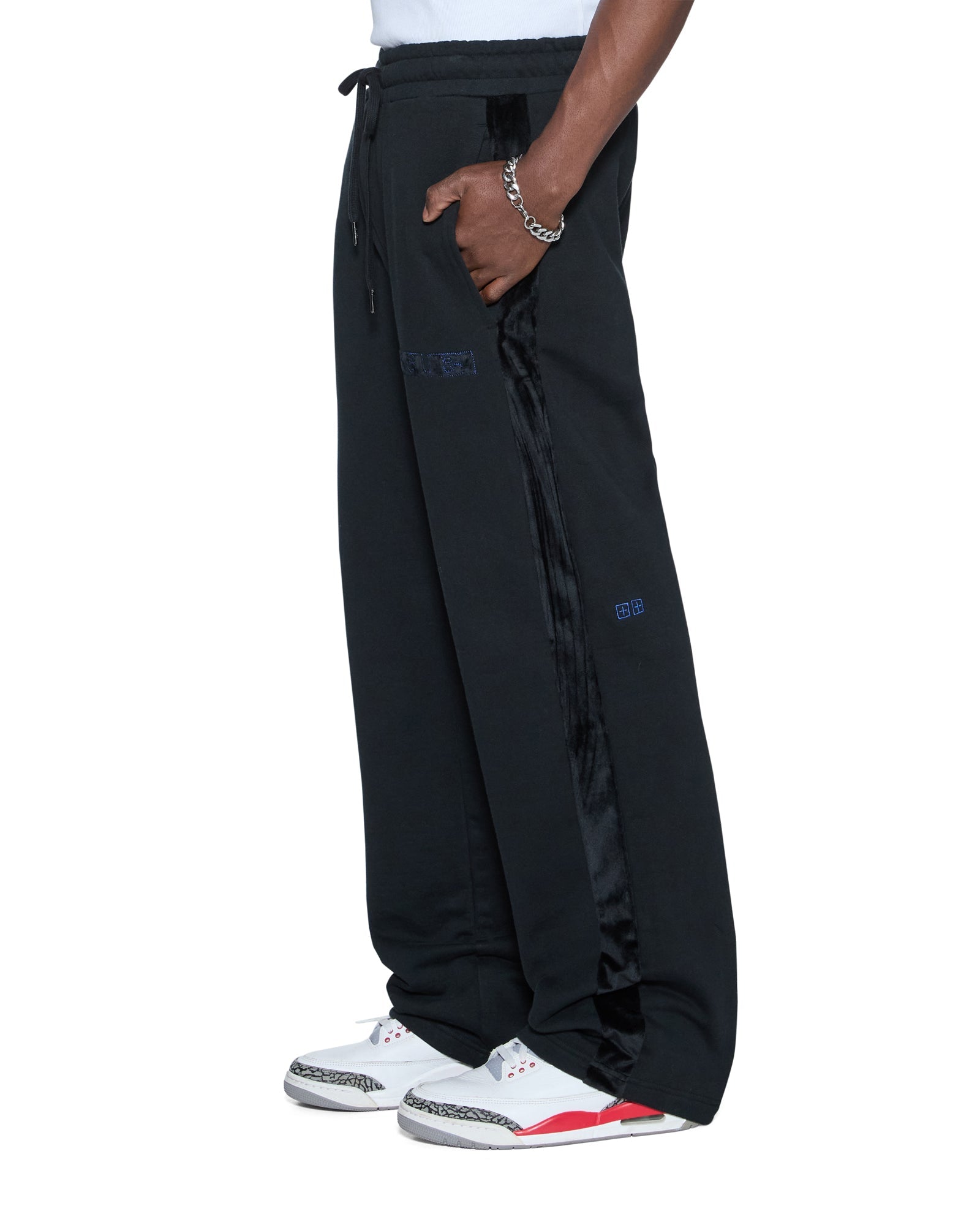 The 4X4 Luxe Synthesis Trak Pant Black is a mid-rise, straight leg track pant with an elasticated waistband and drawcord for all-day comfort. Crafted from premium loopback fleece in a jet black colourway, it features flocked side seam panels with cobalt blue saddle stitching, a Sign of the Times applique logo, and is finished with signature T-box and 4x4 embroidery branding.