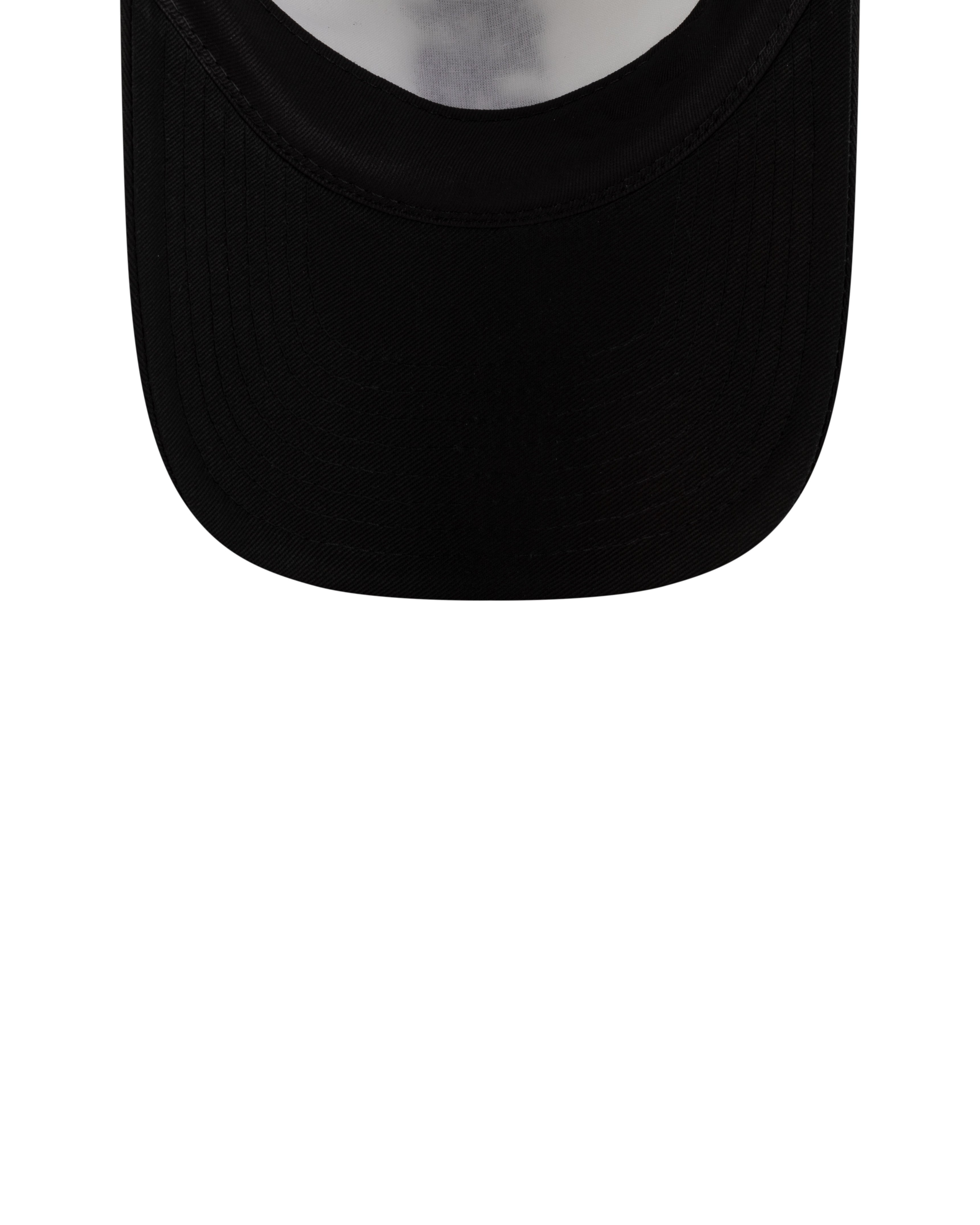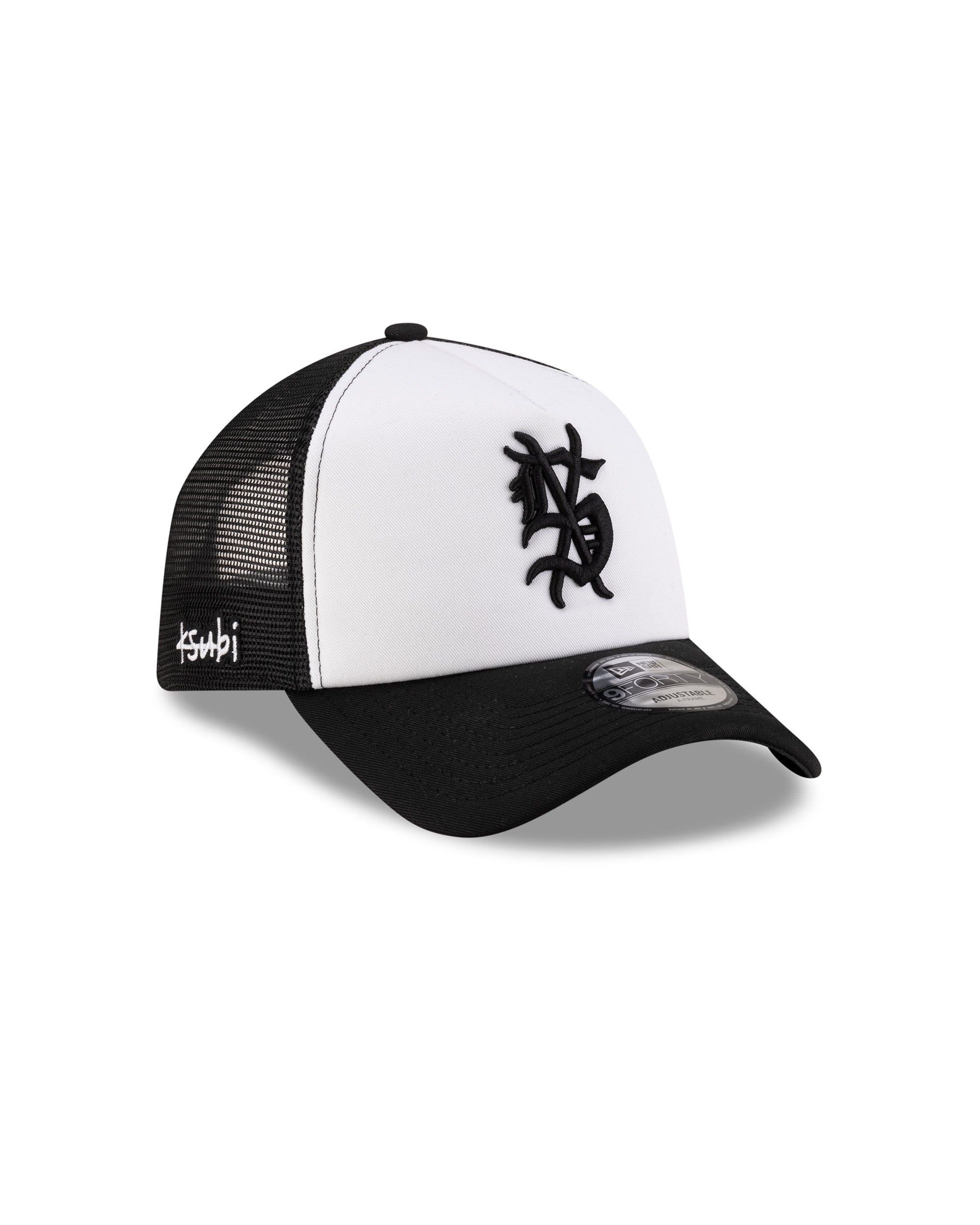 The Ksubi x New Era 9FORTY A-Frame Trucker features an embroidered Ksubi logo on contrast high-profile pinched polyester front panels, contrast visor, mesh side and back panels with a wordmark side embroidery detail, and an adjustable snapback enclosure at the back.