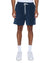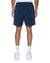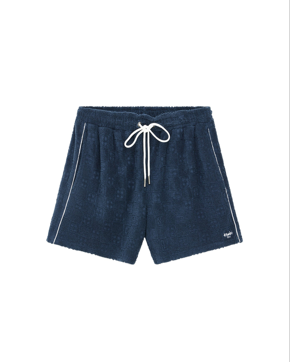 The Lounge Short Navy is a regular fit terry short with an elastic waistband and drawstrings. Made from a custom jacquarded Ksubi pattern in a navy colourway, it features cutaway pockets, a single back patch pocket, and Ksubi branded embroidery on the front left leg. Finished with T-box and 4x4 branding, and Ksubi branded hardware.
