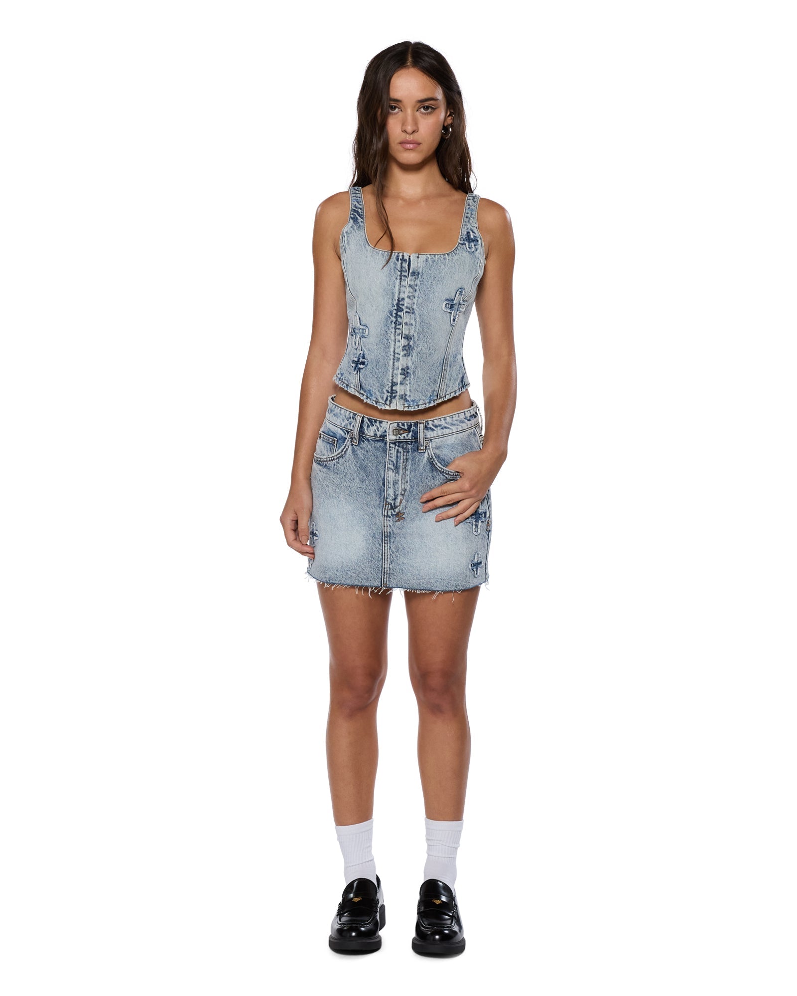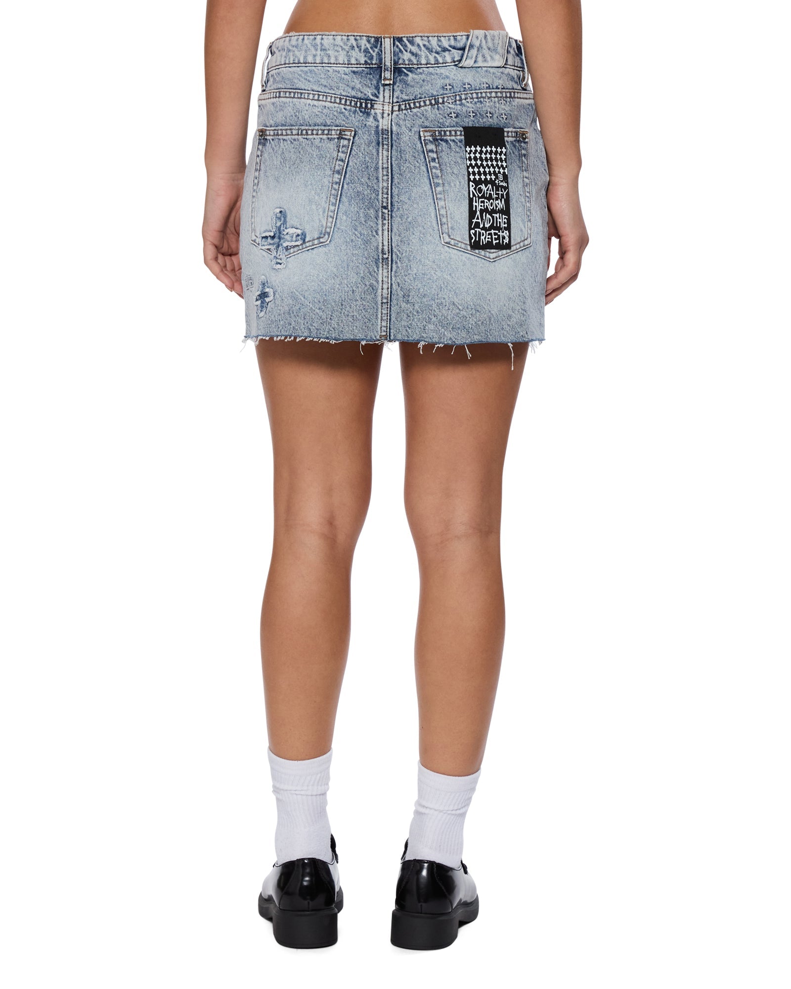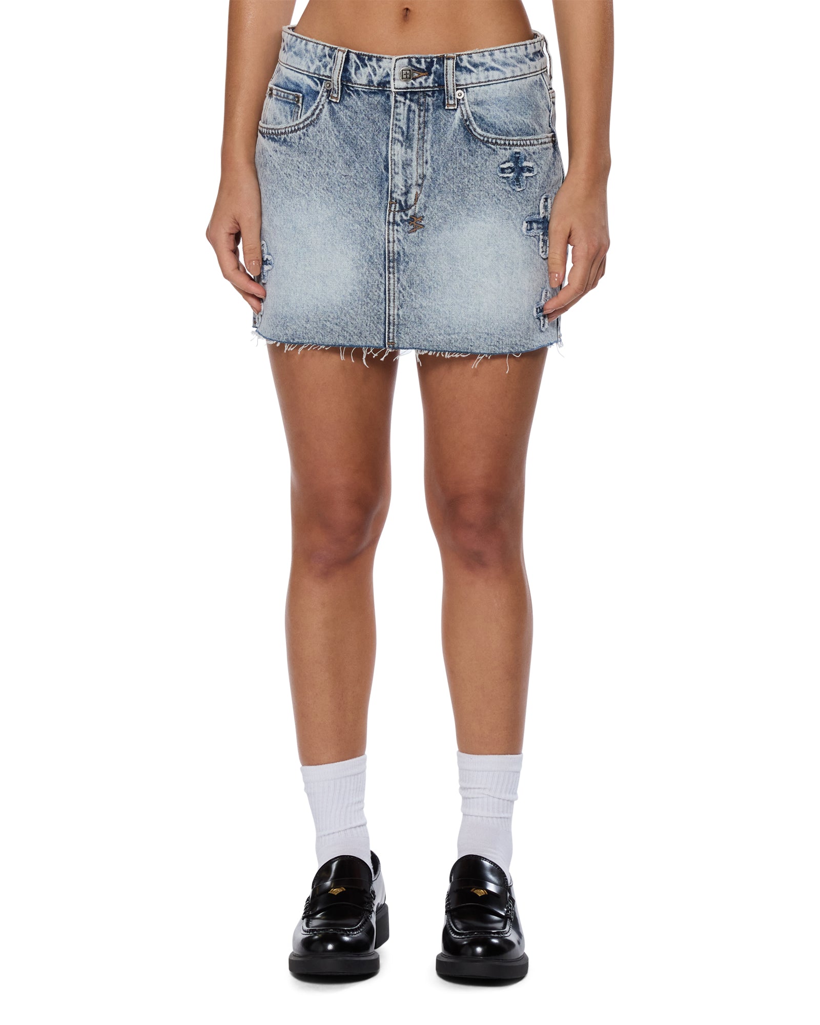 The Low Rider Mini Klassic Kraftwerk is a low-rise mini skirt with classic five-pocket styling, made from premium rigid denim in Indigo Blue Stonewash. It features Ksubi 'plus' applique denim patches on the front and back, Ksubi T-box and 3x4 branding with anti-silver branded hardware, and a removable pocket tag on the wearer's right back pocket.