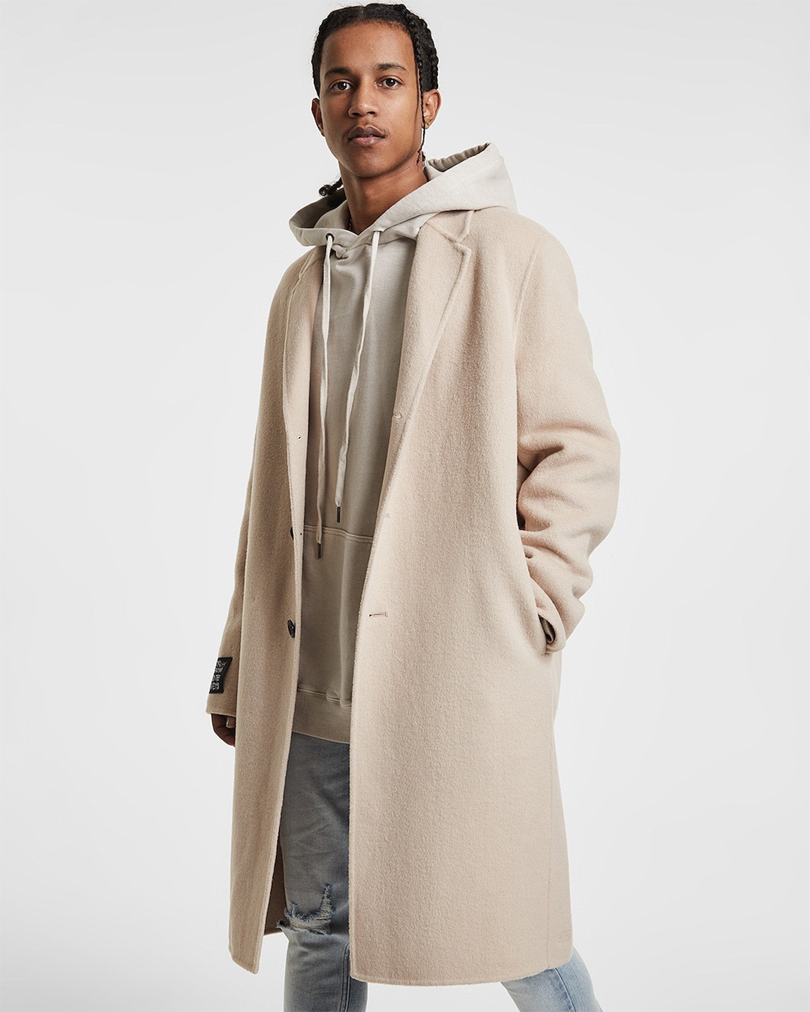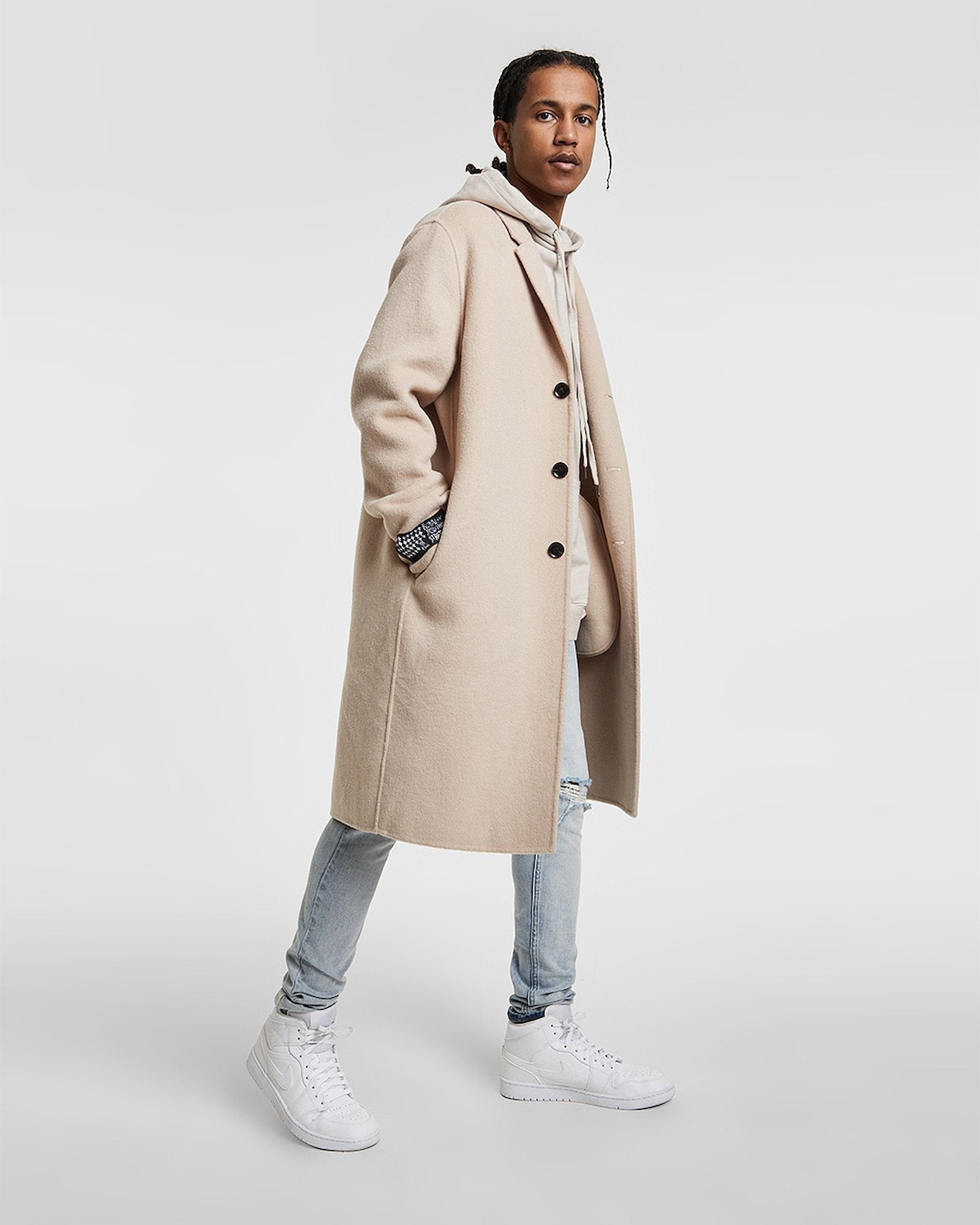 The Mogul Coat is a tailored coat with collar and lapel, two-button fastening and side entry pockets. This mid length coat finishes just below the knee. Made from a premium meltem wool blend in a neutral stone colourway. Unlined through the body with hand-stitched seams, this transeasonal piece can be worn over a tee or extra layers as the cold months progress. Finished with our signature Ksubi branding and sleeve tag.