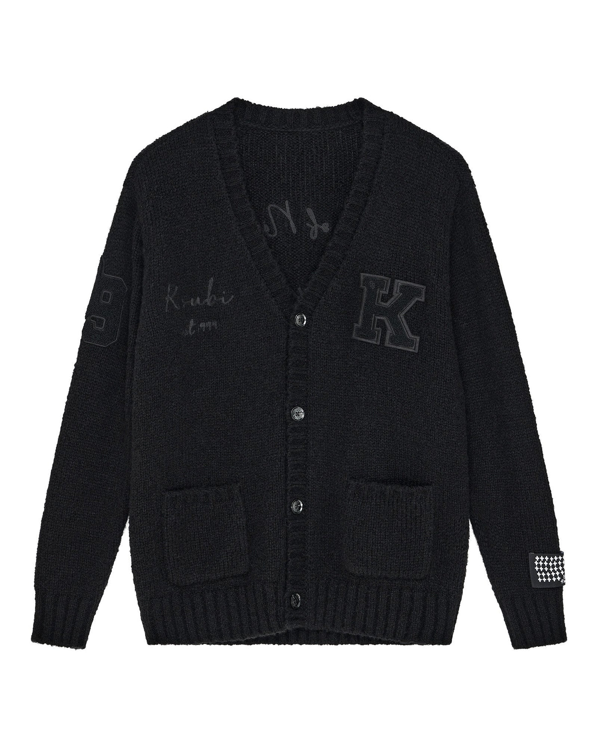 The Salud Cardigan Jet Black is a relaxed fit knit cardigan with a four-button closure and ribbed hem. Made from an 8gg mohair blend yarn featuring black tipping stripes throughout, it includes a 'K' boucle embroidered patch at the chest, tonal chainstitch branding on the body and back, and a '99' felt patch applique on the sleeve. Finished with a Ksubi sleeve tag, T-box embroidered branding, and Ksubi branded hardware.