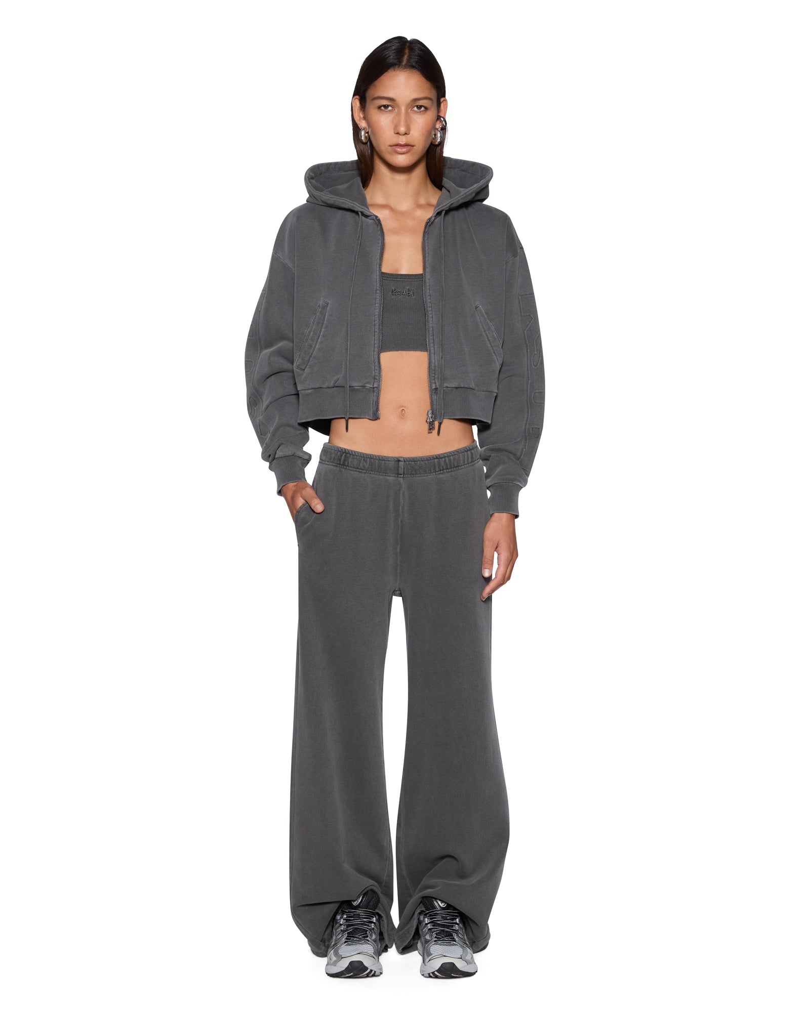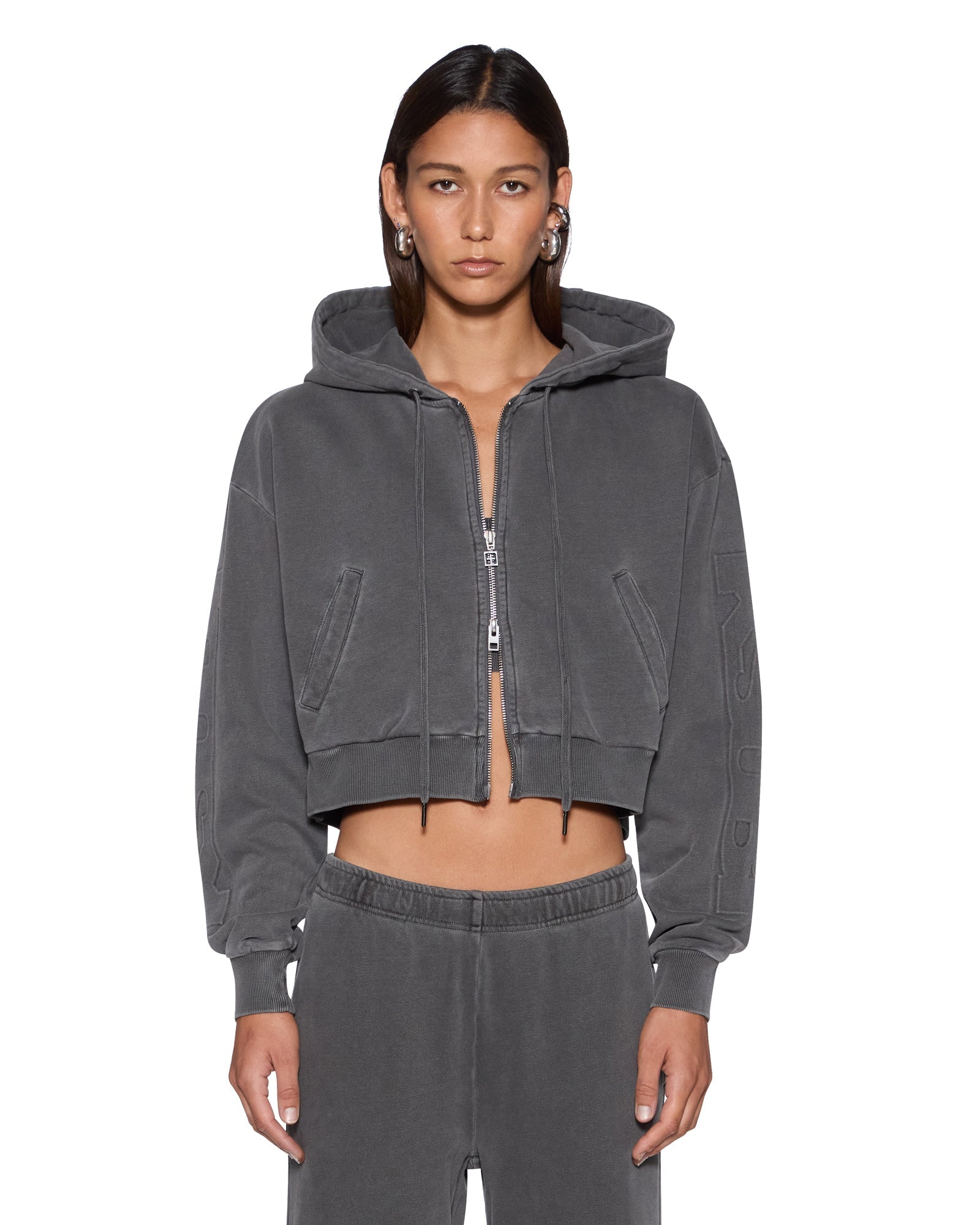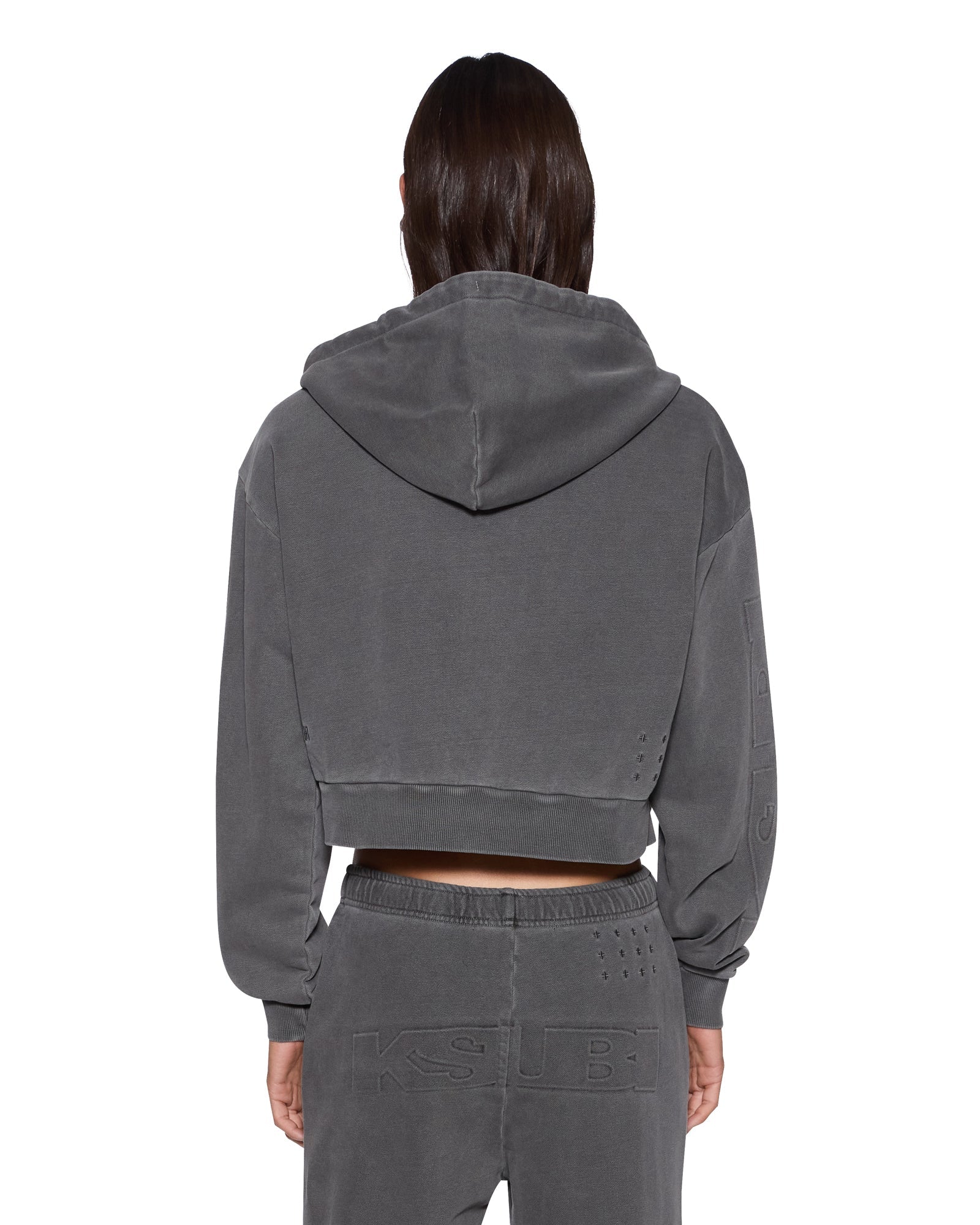 The SOTT Origin Hoodie Charcoal features a relaxed cropped fit with ribbed cuffs and hem in a seasonal grey colorway with an aged wash. Crafted from premium cotton loop-back fleece, it includes a double-ended zip closure for versatile styling, Ksubi branded anti-silver hardware, and front welt pockets. Detailed with SOTT embossed branding down the sleeves, tonal t-box, and 3x4 embroidery, this hoodie is both stylish and functional.