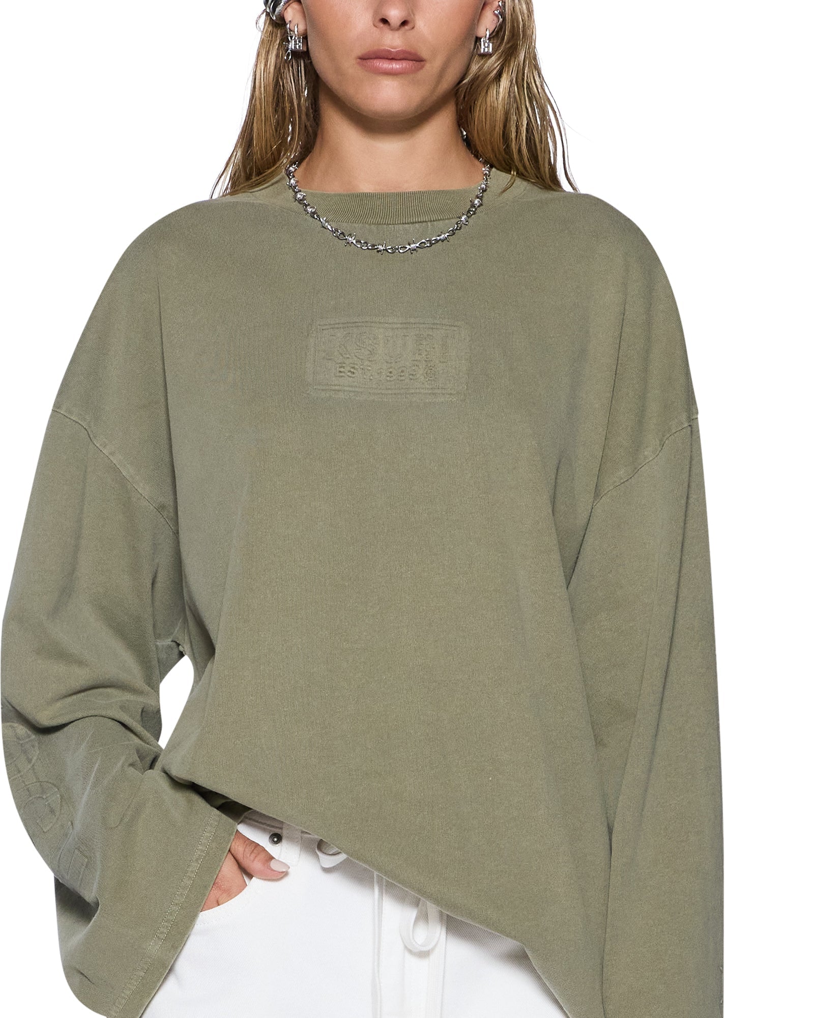 The State Stencil Boyfriend Long Sleeve Tee Militant is a boxy, oversized long sleeve t-shirt with dropped shoulders and a raw-cut back hem. Crafted from premium heavyweight cotton jersey in a militant green colourway and treated with an aged wash for a vintage handfeel, the style features reversed overlocked side seams, seasonal Ksubi stencil-embossed artwork across the front and sleeves, and signature T-box branding.
